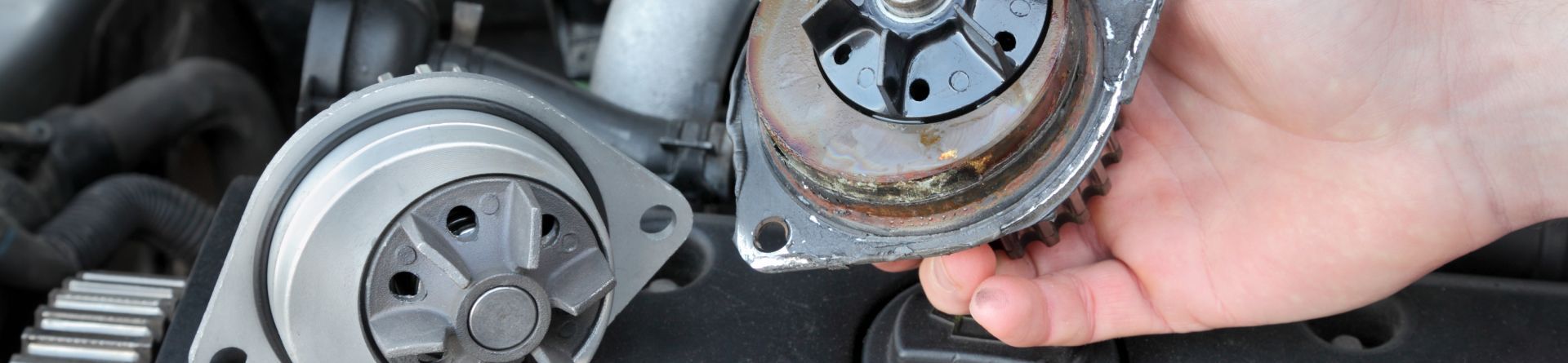 Two water pump assemblies, one damaged and corroded, on a metal surface.